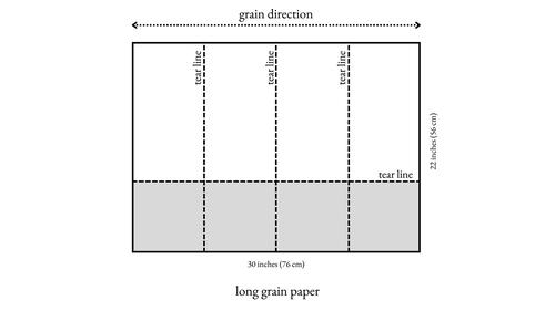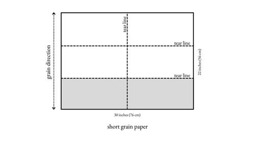 Long grain paper: Stack the two half sheets together and along the15-inch (38-cm) edge, measure and mark the halfway point. Draw a tear line along the length of the sheet. Tear both sheets together along this line with a metal ruler. You should have four sheets of 7½ x 22–inch (19 x 56–cm) paper. Tear the sheets two at a time, to a length of 15 inches (38 cm). -