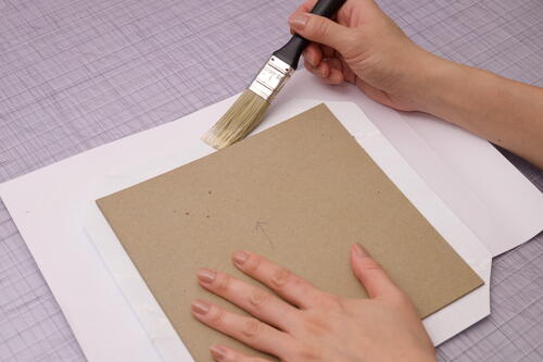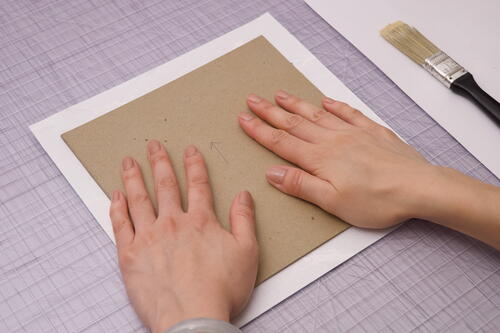 Let’s cover the book boards with decorative paper. Lay out a waste sheet on your workspace and grab the first book board. With a glue brush, spread a thin layer of glue on the front side of the board (the side without the arrow). Match the paper grain by ensuring the arrows of both pieces point in the same direction and place the board in the center of a sheet of decorative paper so that there is an even trim of paper around the edges. Press down gently, then flip the cover over so that the decorative side is facing up.