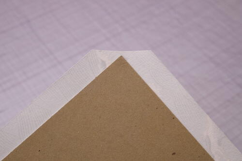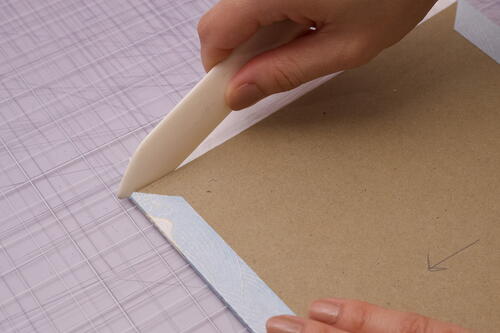Starting at the top edge of the cover, brush a thin layer of glue onto the tab of decorative paper. Wrap the tab around the board and press firmly throughout. Smooth out the glued tab with a bone folder. Repeat for the tab on the opposite side of this cover.