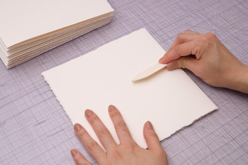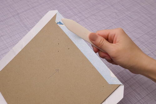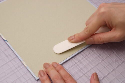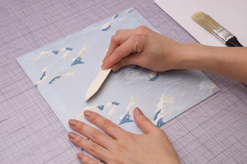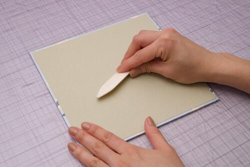 Rub on the decorative paper using the length of a bone folder with medium pressure. Gently rub outward from the center to smooth out any bubbles or wrinkles. You can also use your fingers and palms to press out the bubbles.