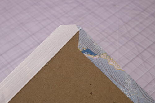 Flip the cover over. Cut each corner of the decorative paper at a 45-degree angle, leaving about 1/8 inch (3 mm) of excess. This tiny space should be slightly wider than the thickness of the board, and is important for the next step of neatly wrapping the cover material around the book board, also known as turn-ins.