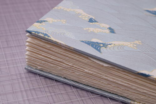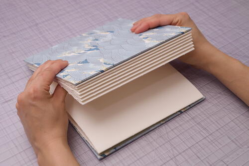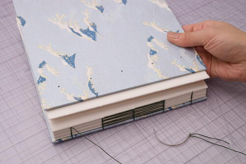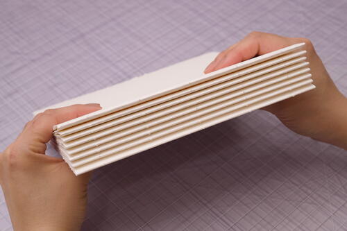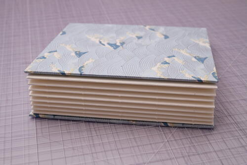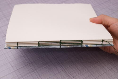 Close the book and admire your work! Check your thread tension. If it’s too loose, you may need to tighten more often as you sew. With the right amount of tension, it is normal for the book to not close completely as the sewing is still fresh. You can weigh down or lightly press your book for at least half a day so that the binding can relax before using it. The binding will also relax naturally as the book is used over time. With any exposed spine bindings, it is also normal for the signatures to shift or have some wiggle room. Even if the binding loosens, the book will not come apart if you used strong thread.