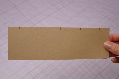 The strip of stiff paper, which is the same length as the signatures, will be your guide for punching holes. Measure and mark ¾ inch (1.9 cm) on the long edge from the left and right sides. Then mark three more points spaced 1½ inches (3.8 cm) apart in between the two end points for a total of five marks.