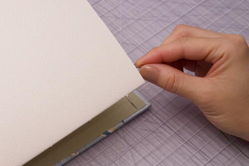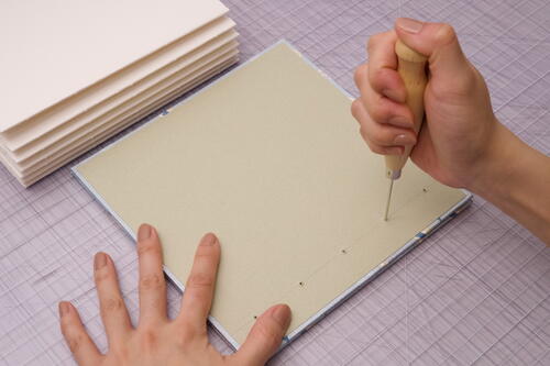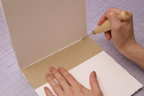 The cover holes may have some bulging from the board material being pushed through. With one end of the bone folder, rub and press the bulges flat so that the inside covers are more aesthetically pleasing. Erase the pencil marks.