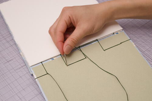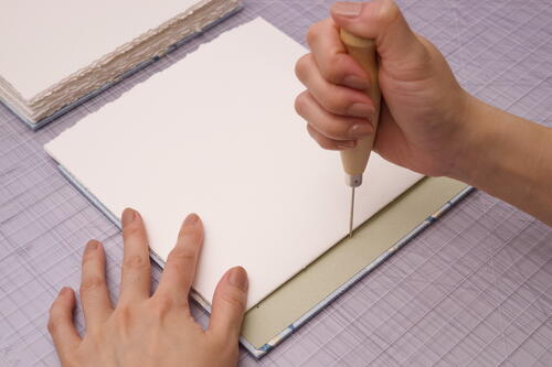 Draw a light pencil line across the back cover 1 inch (2.5 cm) from the spine edge of the board. Line up the bottom signature with the pencil line and center the signature between the head and tail edges of the cover. Using the awl, punch holes into the cover by following the holes of the signature. Since the book board is thick, you’ll have to use some muscle to twist the awl into the cover to create the holes. Push the awl from the front side to the back side of the cover, so that the extra board material will bulge on the inside.