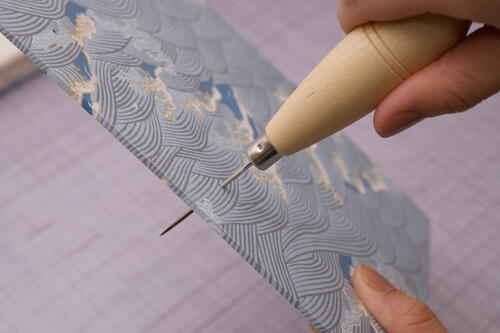 Working on the cutting mat, open the top signature and place the stiff paper guide up against the fold, or the valley, of the signature. Hold the awl at a 45-degree angle and punch holes through the fold at each point marked on the guide. Pierce the paper until the needle tip is visible on the other side and do not enlarge the holes. Repeat this step for all eight signatures. Hold all the signatures together and check that the holes are aligned.