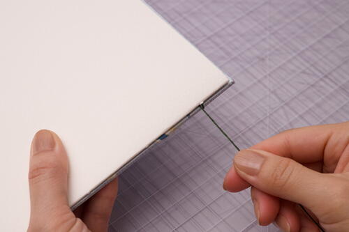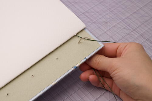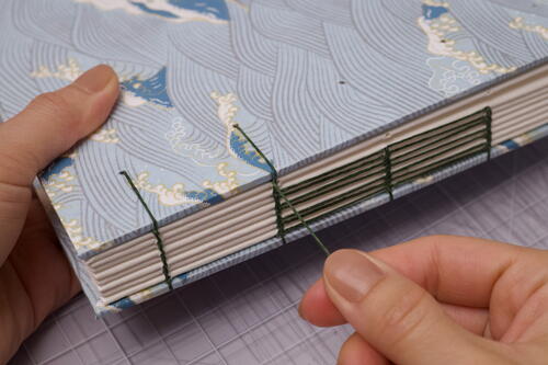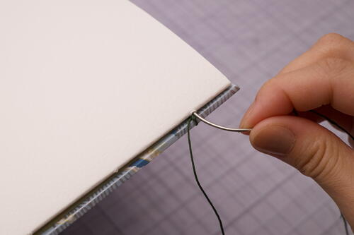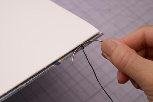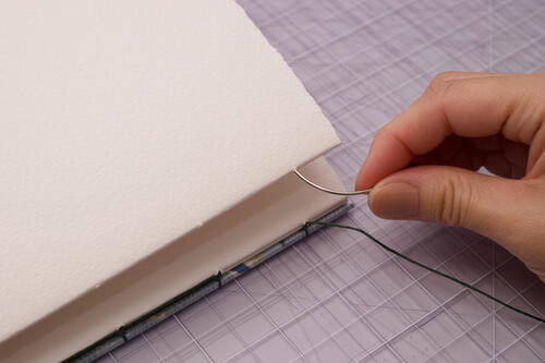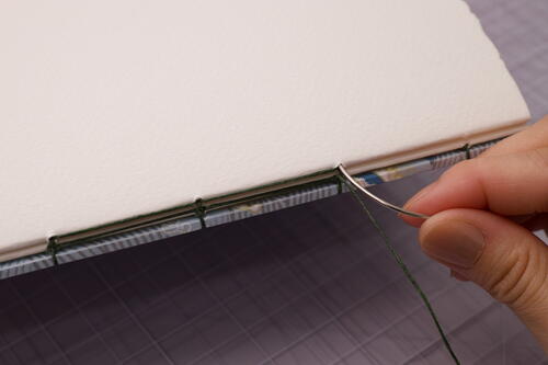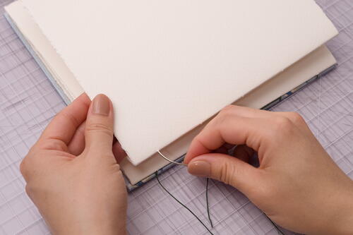 After you finish sewing on the 7th signature, add the final signature and front cover to the book. It’s tricky to get the thread tension right at this next stage, so take your time and remember to not over-tighten stitches.