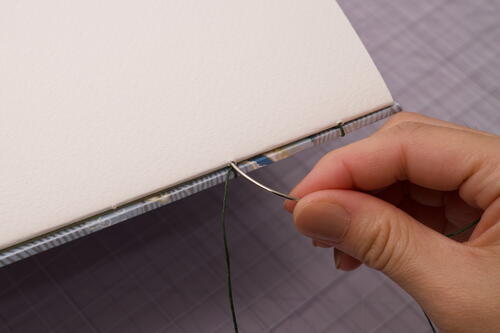 Sew out through station 2. Loop your needle behind the stitch connecting the cover and the 1st signature. You may have to open the book slightly to make room for your needle. Make sure you are not sewing under the stitch that attaches the back cover. Pull taut, then sew back into station 2.