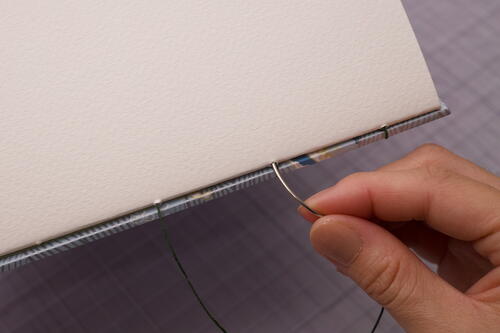 To add a new signature, flip the next signature from the stack onto the working book and match the alignment of the sewing stations at a glance. Starting from the outside, sew into station 1 of the new signature. Hold the book firmly together with your non-dominant hand to prevent excessive shifting.
