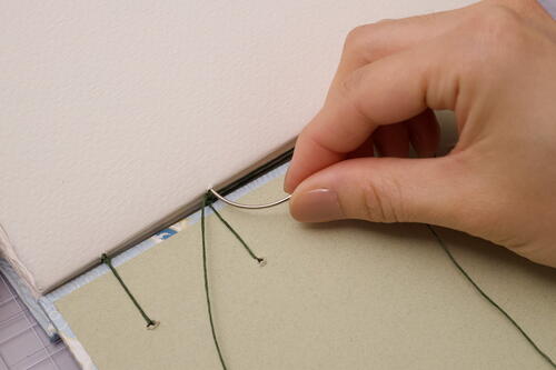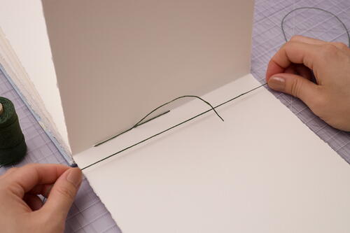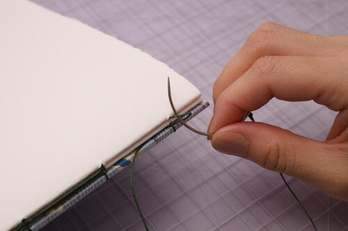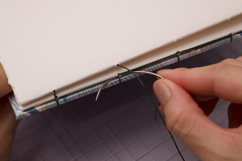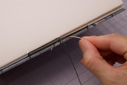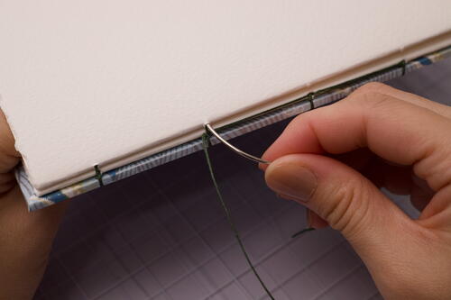 Sew out through station 5 and create a kettle stitch with the stitch directly below. For Coptic books, make a kettle stitch when you reach the end of every signature. To add odd-numbered signatures, start in sewing station 5 and end at station1.