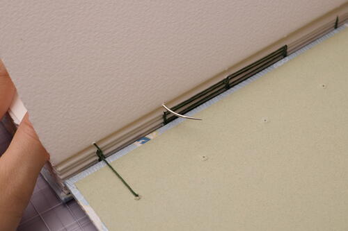Place the book on the desk with the spine facing you. Measure the waxed linen thread to ten times the length of the book and cut with scissors.