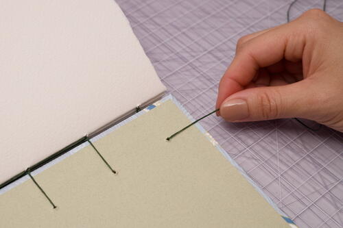 Sew behind the vertical stitch, bringing your needle from right to left in the space between the cover and signature. Pull taut.