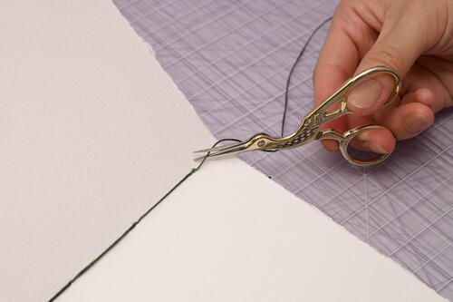 Create a ladder stitch by sewing out through station 3, then in through station 2, and back out through station 3. Repeat steps 20 and 21 for station 3. Your needle should now be on the inside of the signature.