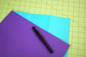 Lay your scored cardstock in front of you in a landscape orientation. Make a mark 3” up from the bottom on the right side. Use a piece of scrap cardstock to connect the point between the 3” mark and the upper left corner of your scored cardstock. Draw a line with a pen or pencil connecting those two points. Then, cut along that line and fold along the scored lines to end up with your tri-folded card base.
