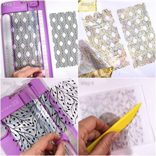 Cut Deco Foil Clear Designer Toner Sheet to 4″x8″. Wipe surface with soft, lint-free cloth and avoid touching printed areas.