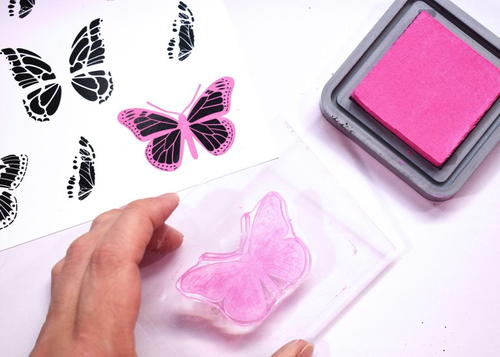 Following package directions, ink butterfly stamp and stamp over corresponding wings image on Foil-Mates Detail Sheet. Let dry. Die cut butterfly and wipe with soft, lint-free cloth.