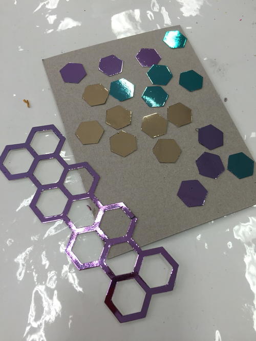 Run 3 hexagons through laminator with purple foil.