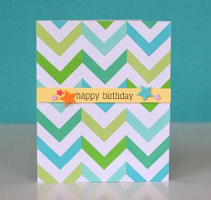Cut several times evenly along a piece of cardstock as shown, keeping the strips connected to the page until you are ready to adhere your design. Be sure to begin cutting each strip at the same spot on the scissors so your chevrons line up. Cut off one strip at a time to adhere onto the tag, leaving equal space between each strip. Trim off excess with scissors along tag.