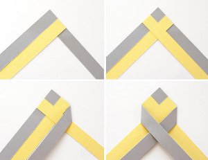 Adhere gray and yellow strips perpendicular onto second gray strip as shown. Adhere second yellow strip perpendicular onto previously adhered strips as shown. Fold right gray strip over to left side, being sure to line up with the left strips. Repeat with the left gray strip over to the right side. Continue with next color always making sure to keep your strips lined up. Create more braids and adhere side-by-side to create chevron design.