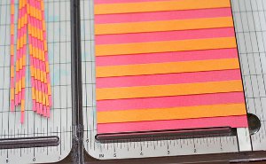 To make your own ikat chevron design, cut half inch strips of orange cardstock and adhere evenly onto pink cardstock as shown. It is very important that you cover the back of the strips completely in adhesive so when cut up, all small pieces will stay as they are. Cut up your design into even, thin strips. You can see from the demo photo that I used the edge of the cutting bar as a guide for cutting my strips. Adhere the thin strips side-by-side onto another piece of cardstock with each strip moved up slightly from the previous for five columns and then move back down continuing the pattern.