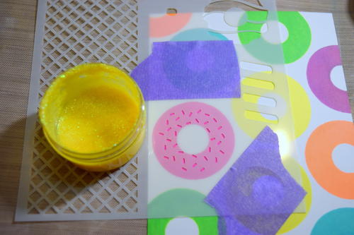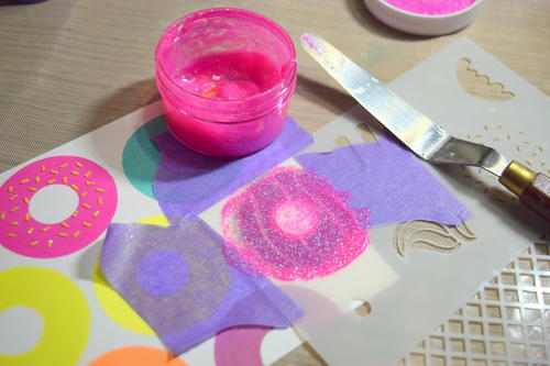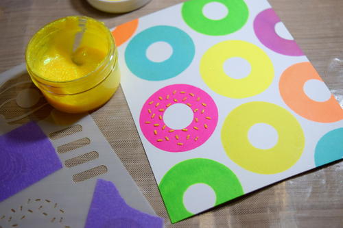 Use Purple Tape to secure Stamp n Stencil sprinkle stencil over first stamped donut. Tape off areas you don’t want to stencil by mistake. Use palette knife to apply Glitz Glitter Gel through stencil.