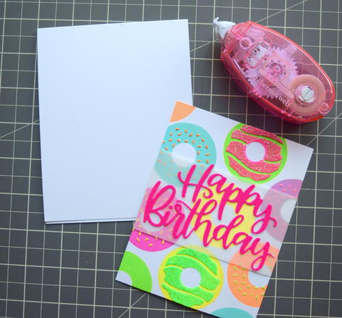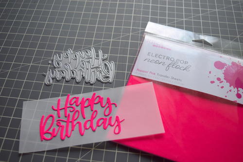 Cut a strip of Electro-Pop Neon Flock and vellum slightly larger than Happy Birthday die. Back flock strip with iCraft Easy-Cut Adhesive Sheets, leaving back liner in place.