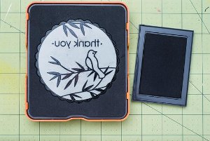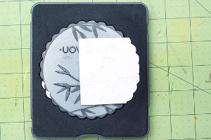 Begin by by using the Fuse Creativity System® with the scalloped circle embellishment and letterpressing it onto white cardstock as usual.