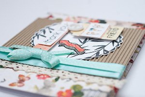 - Layer patterned papers and ribbons to the surface of a 5.5 inch x 7 inch card and adhere the die.