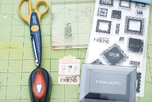 Use the Fiskars Heart Lever Punch in Medium, The Tag Lever Punch in XX-Large, the Scallop Paper Edgers, and the Squarely Sentimental Clear Stamp set to create a small tag. Adhere it to the card with foam tape, as well.