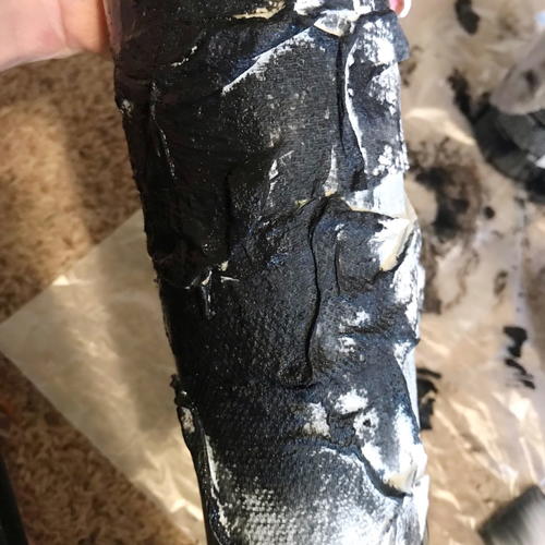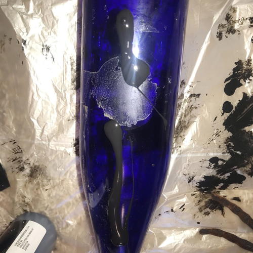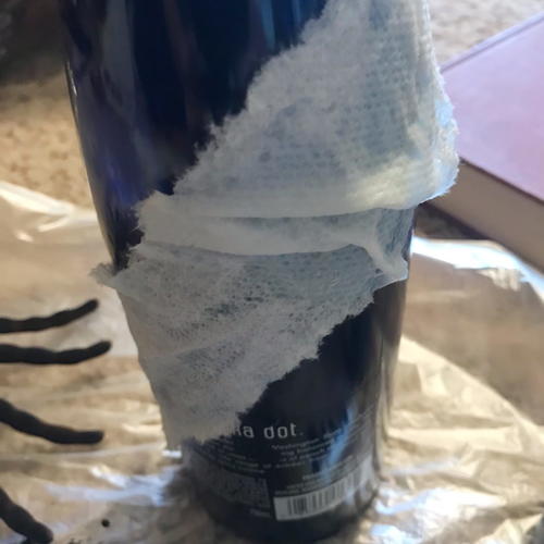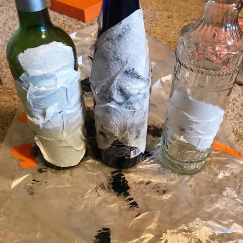 Once the mod podge textured paper towel layer was dry, I painted the bottles black. I used black acrylic paint.