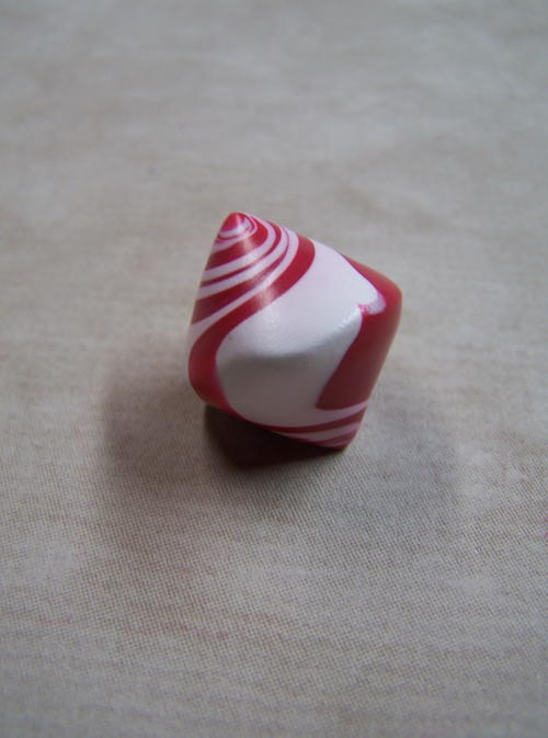 Making the swirl beads: Place a ball on your work surface with the stripes facing upward as in Fig. 9. Hold the plate’s edges with both hands and lower the bottom part of the plate onto the top of the clay ball making sure to center the ball under the plate. Make contact with the clay ball but do not compress it. Begin moving the plate in small circular motions until the ball begins to form a cone shape. Continue to move the plate without stopping until a pleasing swirl pattern forms. Stop moving the pate at this point and observe a bi-cone bead with a swirl pattern has formed (Fig.10 A & 10 B). Place the center of the plate on the top point of the bi-cone bead and press until a disc shape has formed (Fig.11). Repeat with the remaining clay balls making sure to clean your plate and work surface between beads.