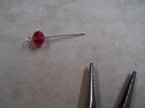 Assembly: Trim four (4) eye pins down to ½” (Fig.13). Thread a large bead onto the eye pin and use round nose pliers to form a loop or second eye (Fig. 14). Repeat with another large bead and two (2) small beads. Use the needle nose pliers to cut the silver chain. Measure 6” from the clasp on either side of the chain and cut. Use jump rings to connect faceted beads and swirl beads to one another. To open and close a jump ring: hold the jump ring between two pairs of needle nose pliers at 9:00 and 3:00 with the opening at 12:00. Move the pliers simultaneously in opposite directions until the ring opens. Insert the eye pin then reverse the motion to close the ring. Begin with the large swirl bead. Add a jump ring to one side then add a large faceted red bead followed by another jump ring. Add a small swirl bead then another jump ring. Add a small faceted red bead followed by a jump ring. Before closing the last jump ring attach one end of the chain. Repeat this process on the other side of the large swirl bead. For the earrings: Insert a head pin into a small bead. Trim wire to 1/3”-1/2’ and use round nose pliers to for a loop. Add a jump ring and add to a small swirl bead. Add a jump ring to the other end of the swirl bead and attach the fishhook before closing the jump ring. Repeat for the other earring.