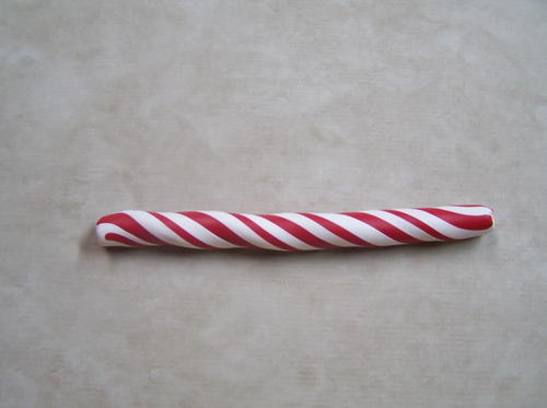 Cut the striped log in half. Use hand pressure to condense each half making it shorter and wider. Occasionally roll the compressed log on a hard surface to keep its cylindrical shape. Continue to work one shorter log until it is approximately 2/3 as long and 2/3 wider as the other log (Fig. 6).