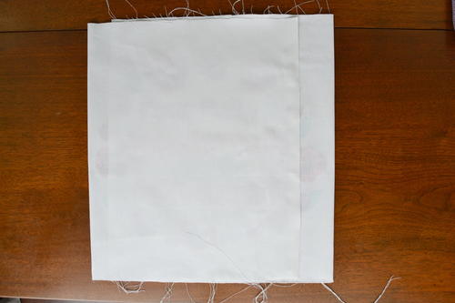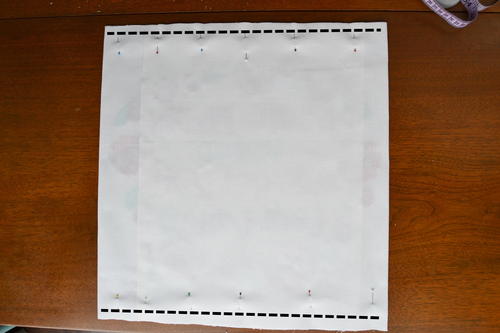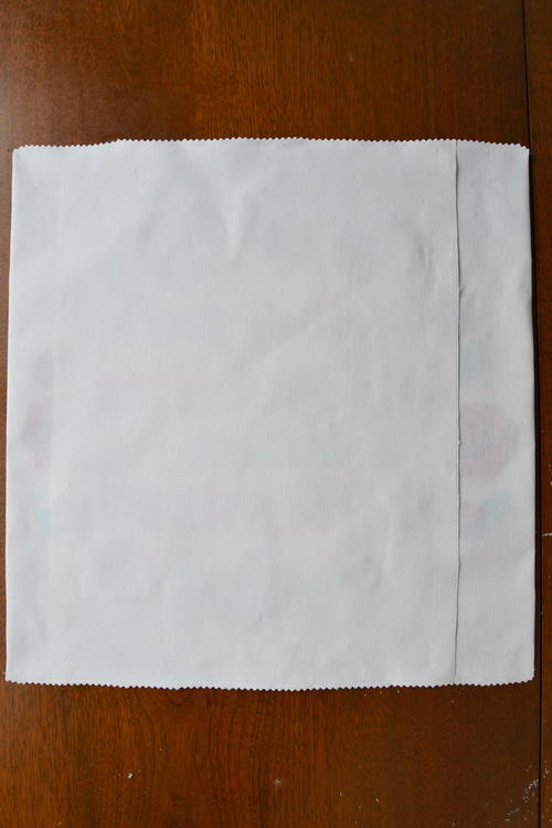 Lay your white fabric down with the design facing up. Fold one side of your white fabric over but be sure to keep your design in the middle. Fold the other side over to the middle as well. Again, you need to make sure to keep your design in the middle. You want the middle square where the design is to measure about 17 inches across once you are done with the folding.