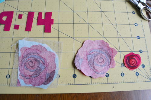 Cut flowers out of the floral print fabric. If your print has leaves then cut those out as well. If not then cut some simple leaf shapes out of one of your coordinating fabric colors. Peel the paper backing off of some fusible web and apply to the back of the flowers and leaves.