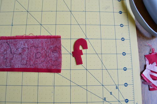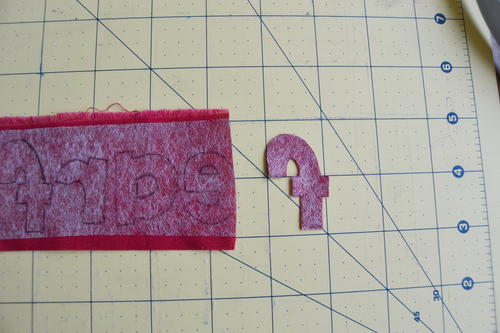 Cut out each word in a long strip. Peel the webbing off of the paper backing and finger press the webbing onto the back of your fabric. Finger press each word onto a different color fabric.