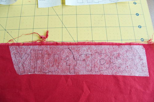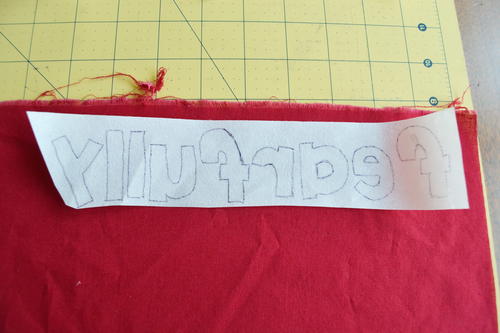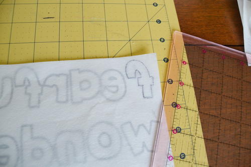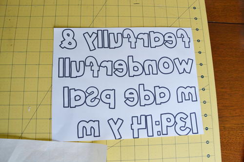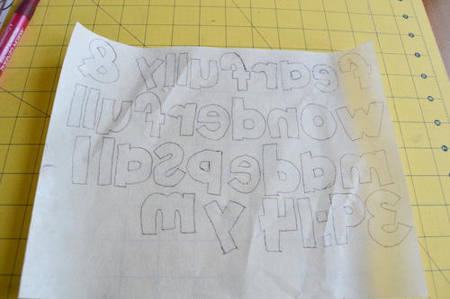 Put a piece of fusible web on top of the printable with the web side facing up and the paper backing down. Trace the outline of all the letters onto the fusible web.