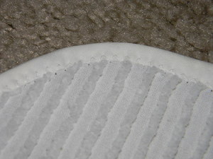 - Place one washcloth on your work surface. If your chenille has a right side and a wrong side, place the washcloth with the wrong side facing up. Pin the bias tape on one edge, with the folded end positioned in the center of the edge and the wrong side of the bias tape facing up. Continue to pin the tape around the edge of the washcloth. Overlap the ends a 1/2 inch where they meet and cut the tape.