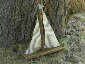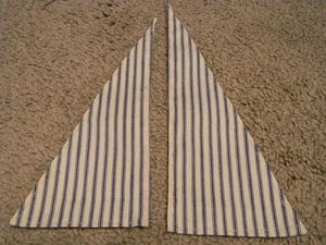 - Pin the sail patterns to one layer of muslin or ticking fabric with the small sail angling to the left and the large sail angling to the right. Cut out the sails.