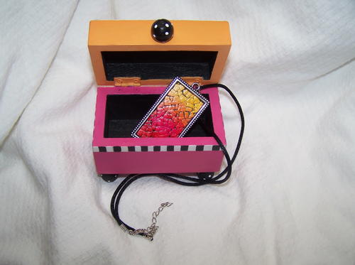 "Who wouldn't appreciate a handmade pendant tucked inside a matching hand painted gift box? Real eggshells colored with alcohol inks are the star of this project! You don't have to be a painter to doll up a plain wooden box to match this pendant. Keep supply cost down by changing up the colors to use whatever inks and paints for you have on hand. Tailoring the mosaic to other shapes of bezels and boxes is easy-peasy! "