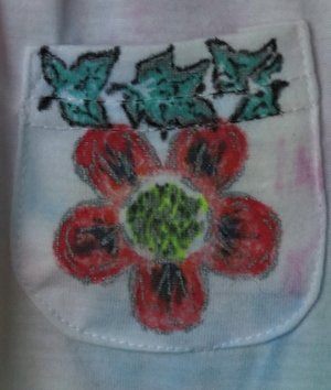 - Use the red and yellow textile pens and the flower stamp to add a flower to the T-shirt’s pocket.