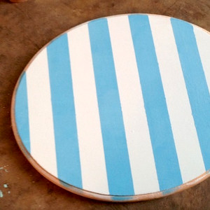 - This is the part that older kids can handle, but you might have to help the young ones. Make stripes on the back of your plaque with painter’s tape and then paint over the top with Pool Blue. Remove the painter’s tape immediately after painting.