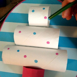 - While the plaque is drying, cut your tp rolls into various lengths. You want three for the tree top and then one for the tree base. Paint the three larger rolls with White and the tree base with Bright Magenta.