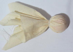 - Place the bead into the centre of the unbleached linen square and wrap it up. Use a piece of thread to secure the fabric around the bead.