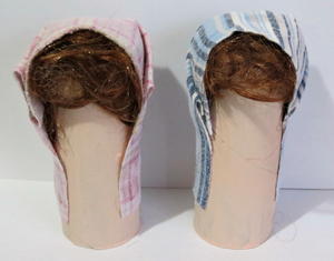 - Use the pink-and-white striped material to add Mary’s head scarf and the blue-and-white striped material to add Joseph’s head scarf. Fold each scarf neatly around the head and use glue to keep it in place.