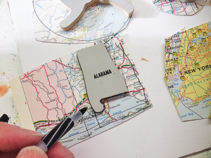 - Apply a thin layer of decoupage to the back of the map and press it onto the wooden shape. Once it is positioned properly, allow it to dry for about 40 minutes before applying a coat of decoupage over the top.