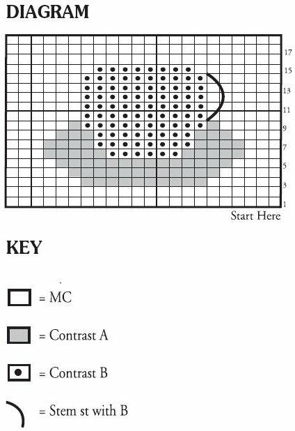 Embroider Diagram over stocking st area as illustrated. Fold strap over to back and sew button in position. Trim tea towel, pleat top edge to fit and sew to WS of Towel Topper.