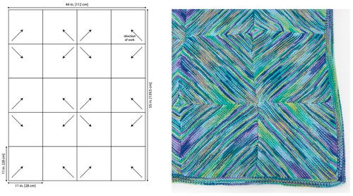 Throw is made from twenty squares sewn together following assembly diagram (click here for larger version).