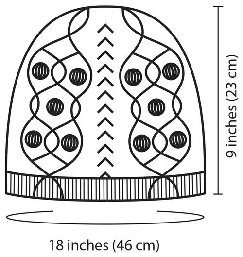 18 inches (46 cm) circumference x 9 inches (23 cm) tall, blocked
