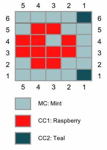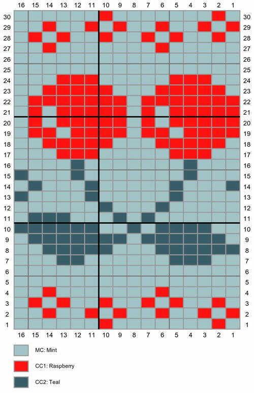 Work rnds 1–30 of Colorwork Chart A, joining CC1 and CC2 where shown. The chart repeats 4 (5, 5) times around the sock. Cut CC2 after rnd 16. Cut CC1 on completion of chart.